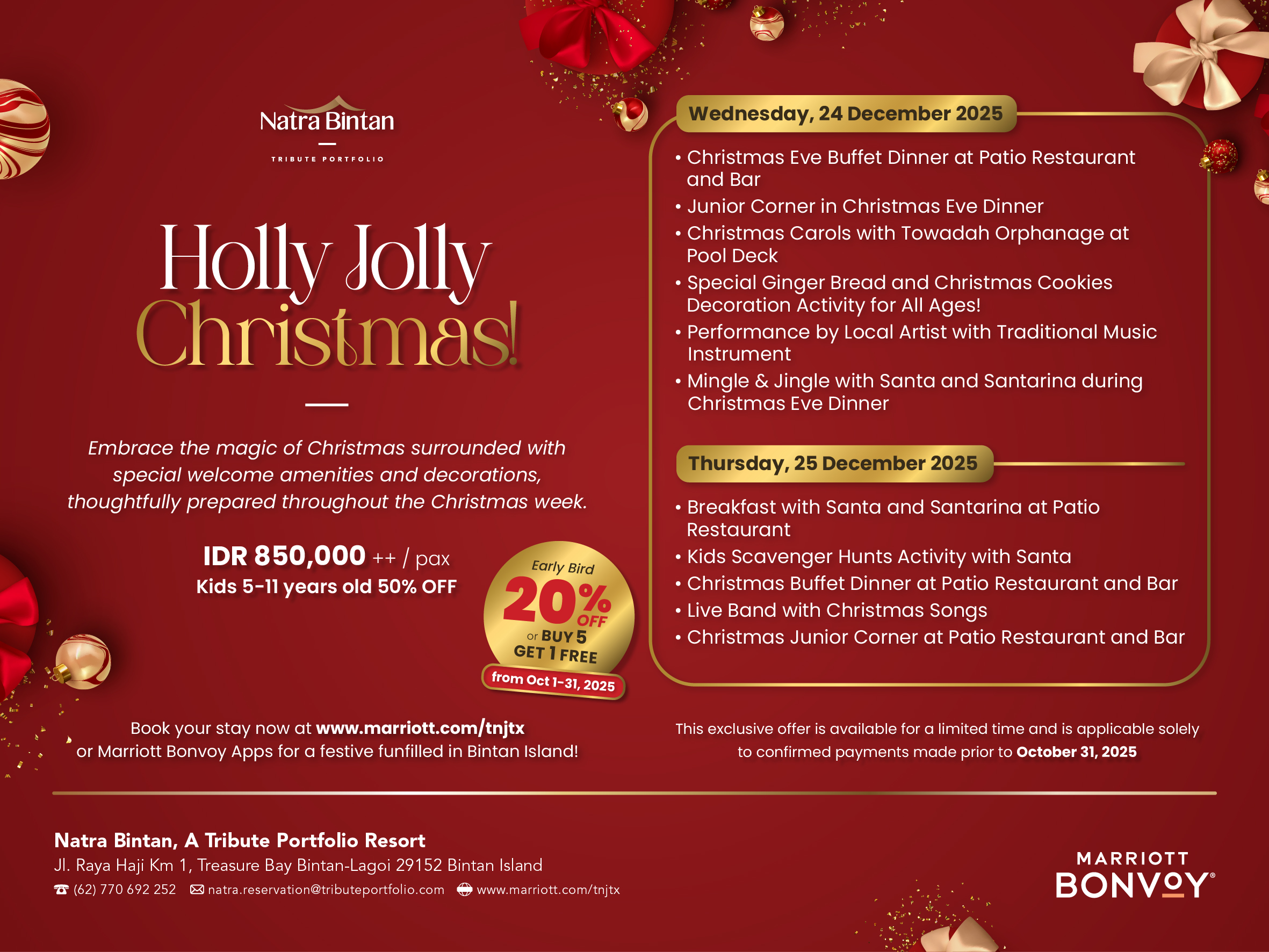 Discover unforgettable festive moments surrounded by nature’s tranquility and Natra Bintan’s signature warmth. Create lasting memories with exquisite dining, joyful celebrations, and a blissful island escape like no other.